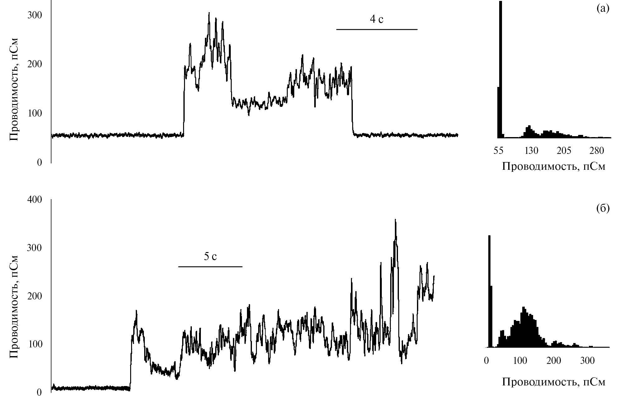 Полученные треки можно разделить по тому, как они выглядят: ступенчатые, двух- или трехуровневые флуктуации проводимости (см. рис. 2). Присутствуют значительные (~100 пСм) скачки проводимости как вверх (рис. 3б), так и с последующим возвращением к исходному состоянию (рис. 3а); флуктуации проводимости непрямоугольной формы (рис. 4 и 5). Для последнего случая кроме гистограмм проводимости были построены автокорреляционные функции