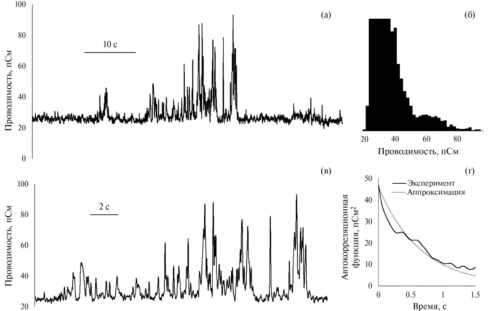 Рис. 5. Флуктуации проводимости азолектиновых мембран в 0.1 М KCl с добавкой 26 мкМ F68: (a) трек, (б) гистограмма (показан локальный максимум в районе 60 пСм, максимум гистограммы приходится на 28 пСм), (в) участок трека в увеличенном масштабе, (г) автокорреляционная функция проводимости, рассчитанная по экспериментальным данным и приближенная экспонентой. Напряжение на мембране 25 мВ.