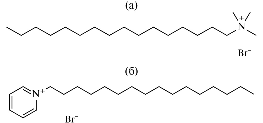 Рис. 1. Структурные формулы использованных ПАВ: (а) бромид цетилтриметиламмония; (б) бромид гексадецилпиридиния.