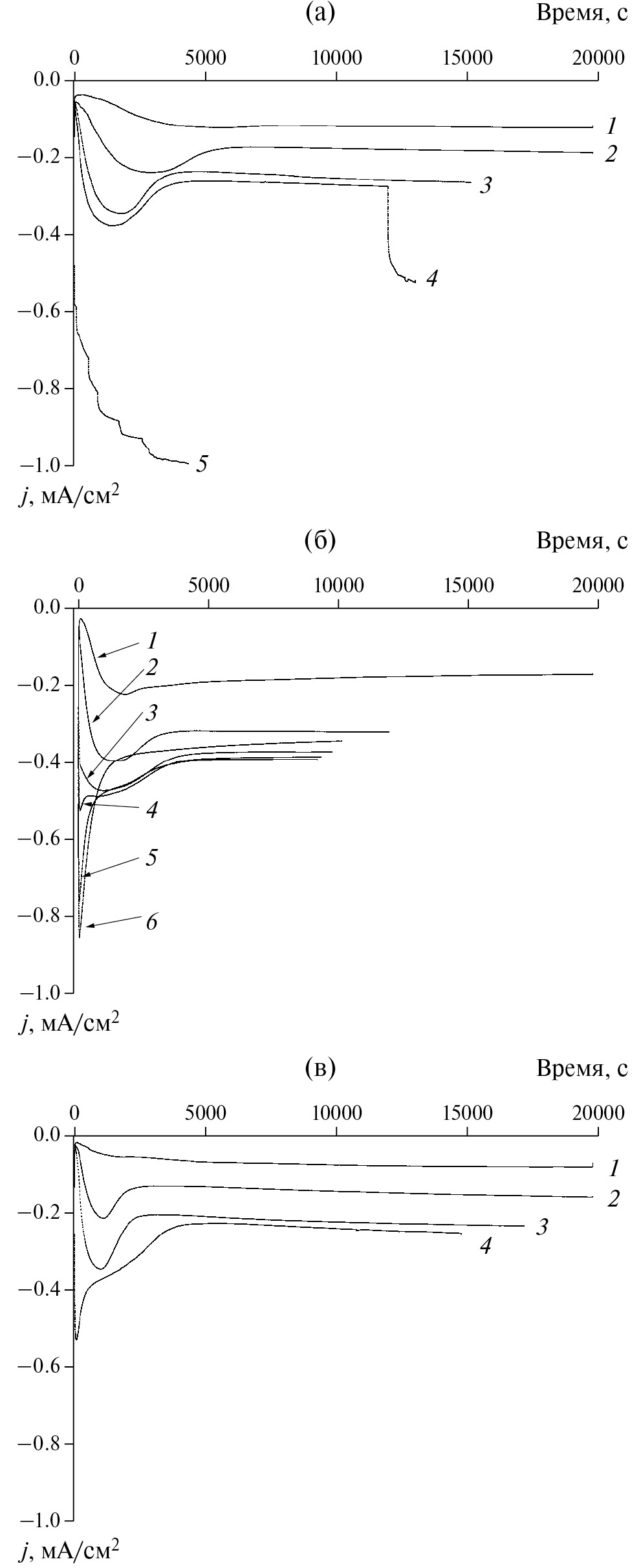 Плотности тока на графиках рассчитывались на геометрическую поверхность электродов. Соответственно, при увеличении истинной поверхности осадка кажущаяся плотность тока, приведенная на графиках, также увеличивалась.