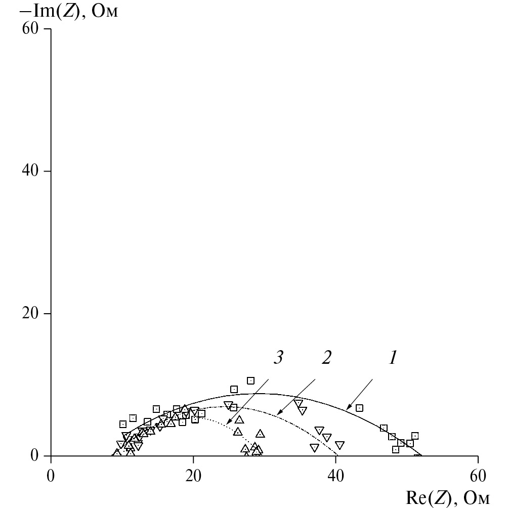 Рис. 5. Эволюция годографов импеданса для электроосаждения лития на электрод из меди. Электролит без добавок ПАВ. Импедансы измерены после электроосаждения при потенциалах: 1 – 0.03 В, 2 – 0.04 В, 3 – 0.055 В.