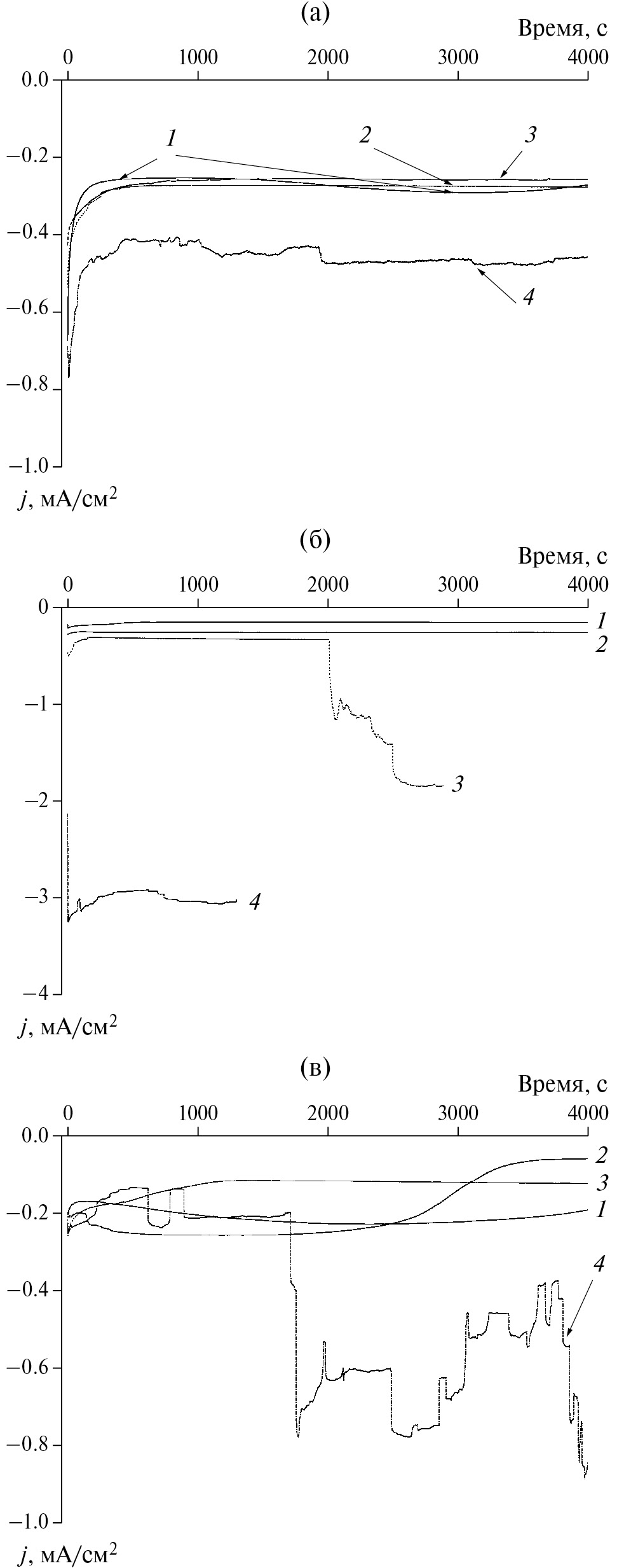 Рис. 6. Эволюция транзиентов плотности тока от потенциала для электроосаждения лития на электроде из лития. (а) Электролит без добавок ПАВ; (б) с добавкой C₁₆Me₃Br; (в) с добавкой C₁₆PyBr. Потенциалы: (а) 1 – –0.04 В, 2 – –0.06 В, 3 – –0.07 В, 4 – –0.085 В; (б) 1 – –0.04 В, 2 – –0.055 В, 3 – –0.06 В, 4 – –0.07 В; (в) 1 – –0.04 В, 2 – –0.05 В, 3 – –0.065 В, 4 – –0.07 В.