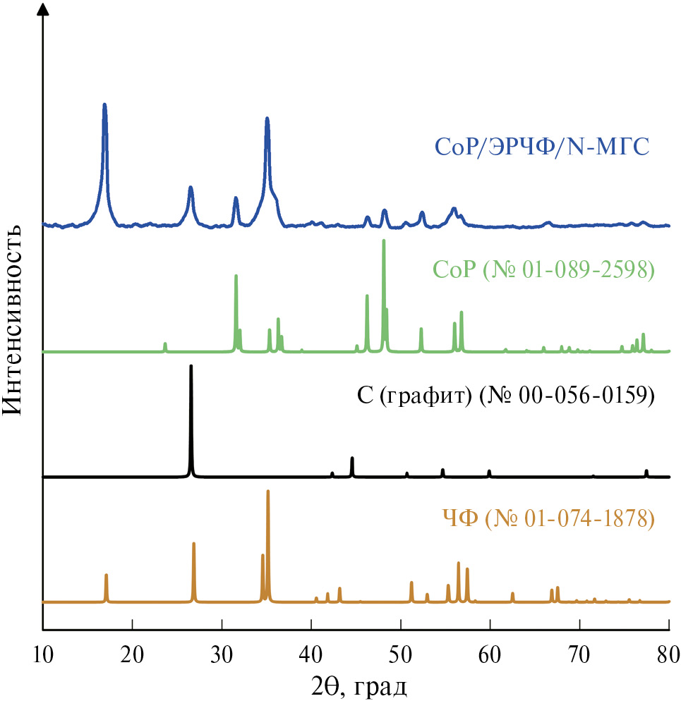 Рис. 1. Рентгенограмма нанокомпозита CoP/ЭРЧФ/N-МГС, а также литературные данные для CoP, ЧФ и графита, согласно PDF-картам № 01-089-2598, № 01-074-1878 и № 00-056-0159 соответственно