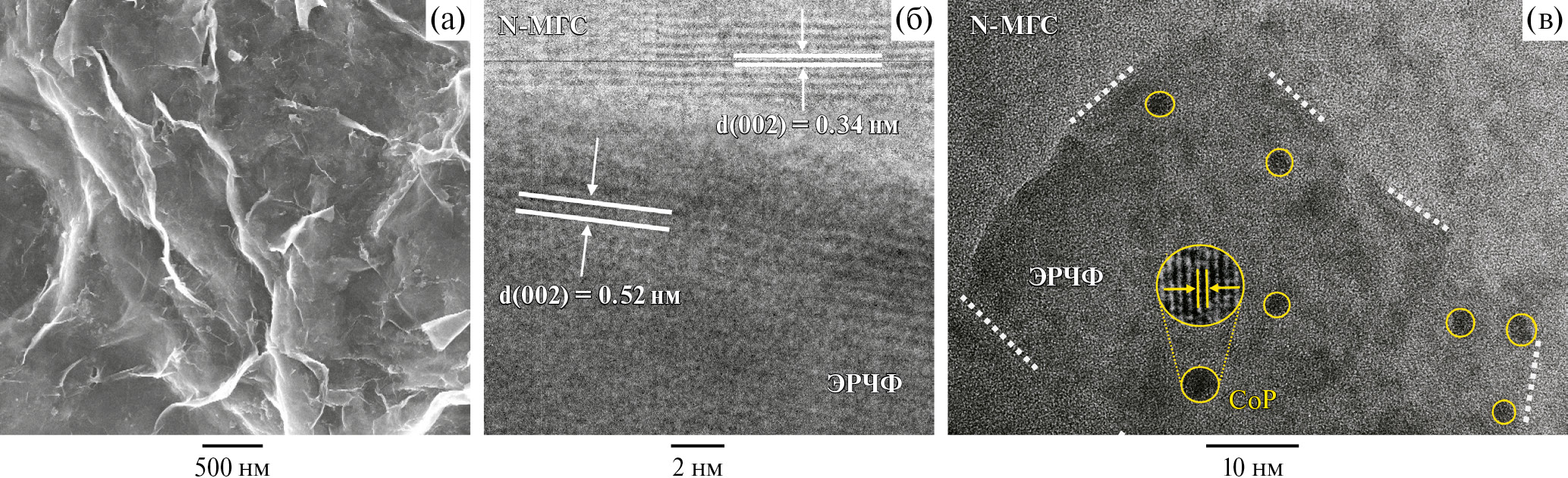 Образцы для исследования методом сканирующей электронной микроскопии (СЭМ) и рентгеновской фотоэлектронной спектроскопии (РФЭС) готовили путем покапельного нанесения суспензии CoP/ЭРЧФ/N-МГС, предварительно обработанной в ультразвуковой ванне, на кремниевую подложку с последующим высушиванием при комнатной температуре в атмосфере воздуха. Электронные микрофотографии исследуемых образцов были получены на сканирующем электронном микроскопе Zeiss SUPRA 25 (Carl Zeiss, Германия). РФЭ-спектры получали с помощью Specs PHOIBOS150 MCD (Specs, Германия) с использованием MgKα-излучения (1253.6 эВ). Давление в рабочей камере спектрометра не превышало 4 × 10–8 Па. Исследованная площадь составляла 300–700 мкм2, а информационная глубина – 1–2 нм. Электронномикроскопические изображения высокого разрешения были получены при помощи просвечивающего электронного микроскопа (ПЭМ) JEM–2100 (JEOL, Япония). Ускоряющее напряжение источника составляло 200 кВ. Рентгенофазовый анализ (РФА) был проведен с использованием дифрактометра Aeris (Malvern PANalytical B.V., Нидерланды) с CuKα-излучением (λ = 1.5406 Å).