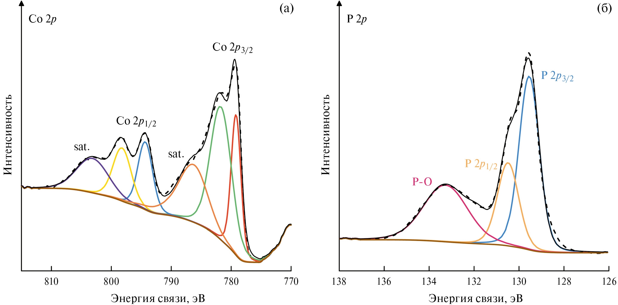 Рис. 3. Co 2p (a) и P 2p (б) РФЭ-спектры высокого разрешения нанокомпозита CoP/ЭРЧФ/N-МГС