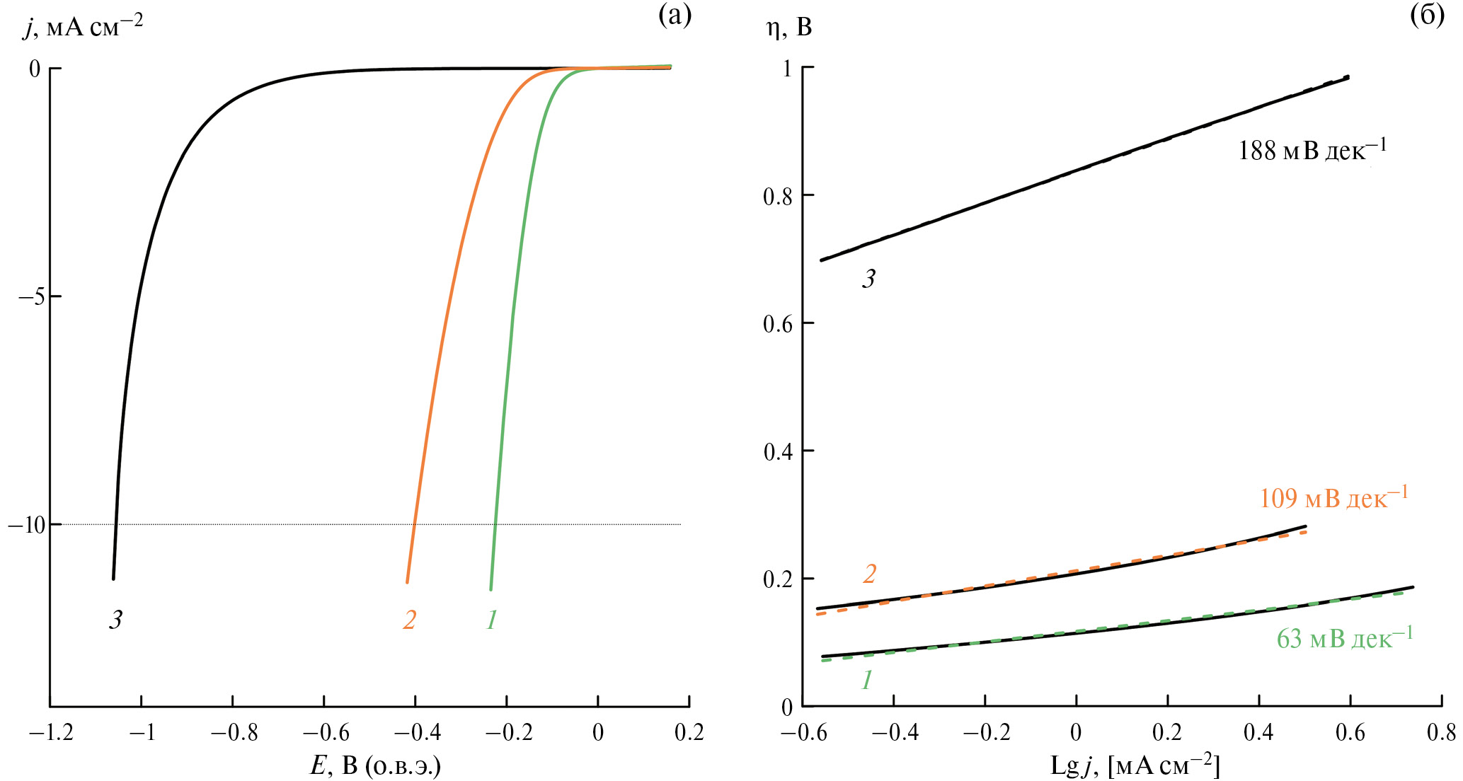 Рис. 4. Вольт-амперные кривые для CoP/ЭРЧФ/N-МГС (1), CoP/ЭРЧФ (2), ЭРЧФ (3) измеренные в насыщенном Ar растворе 0.5 М H2SO4 при ν = 10 мВ/с (a); cоответствующие зависимости Тафеля для CoP/ЭРЧФ/N-МГС (1), CoP/ЭРЧФ (2), ЭРЧФ (3) (б)