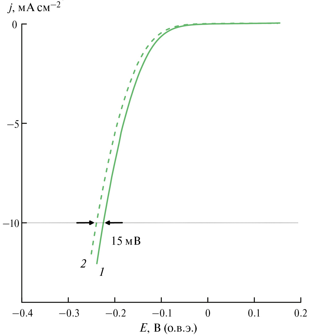 Важной характеристикой любого катализатора также является его стабильность. Вольт-амперные зависимости для CoP/ЭРЧФ/N-МГС, зарегистрированные до и после 500 циклов ускоренного теста на долговечность, приведены на рис. 5. После 500 циклов сканирования потенциала в интервале от 200 до –300 мВ наблюдается увеличение перенапряжения РВВ лишь на ~15 мВ, что может указывать на приемлемую стабильность катализатора в кислой среде.