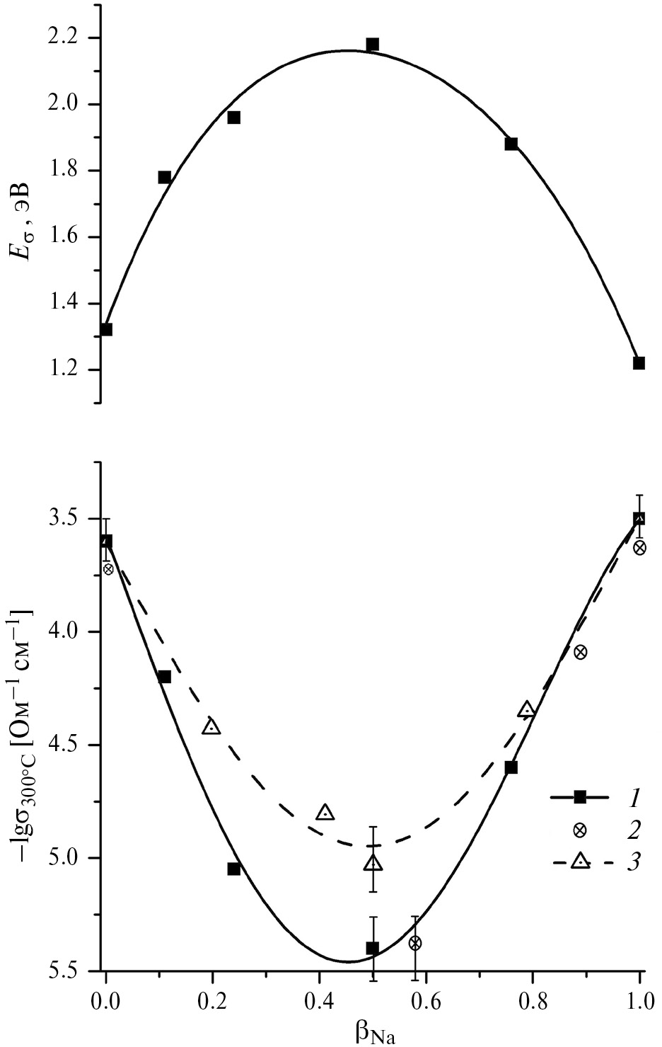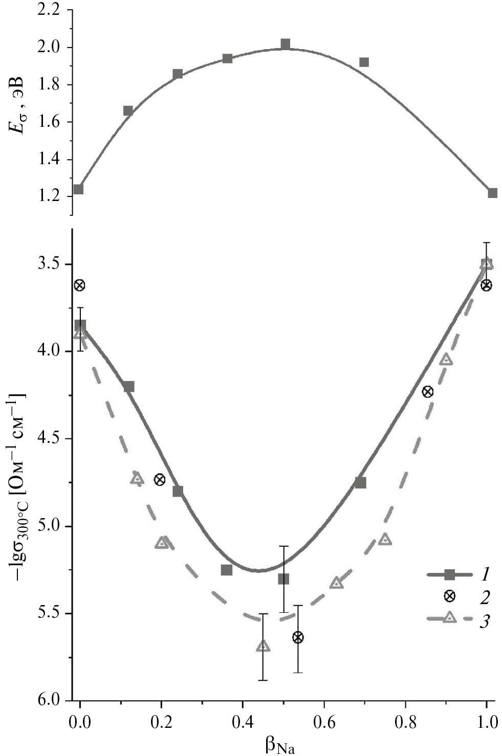 Рис. 2. Изменение удельной электропроводности (σ, при 300°С) и энергии активации электропроводности (Еσ) при эквивалентном замещении лития на натрий в стеклах системы (33.3 – x) Li2O · xNa2O · 66.7SiO2. 1 – экспериментальные данные [29], 2 – данные настоящей работы, 3 – расчет по формуле (7) по собственным и справочным [30] данным для соответствующих монометаллических составов