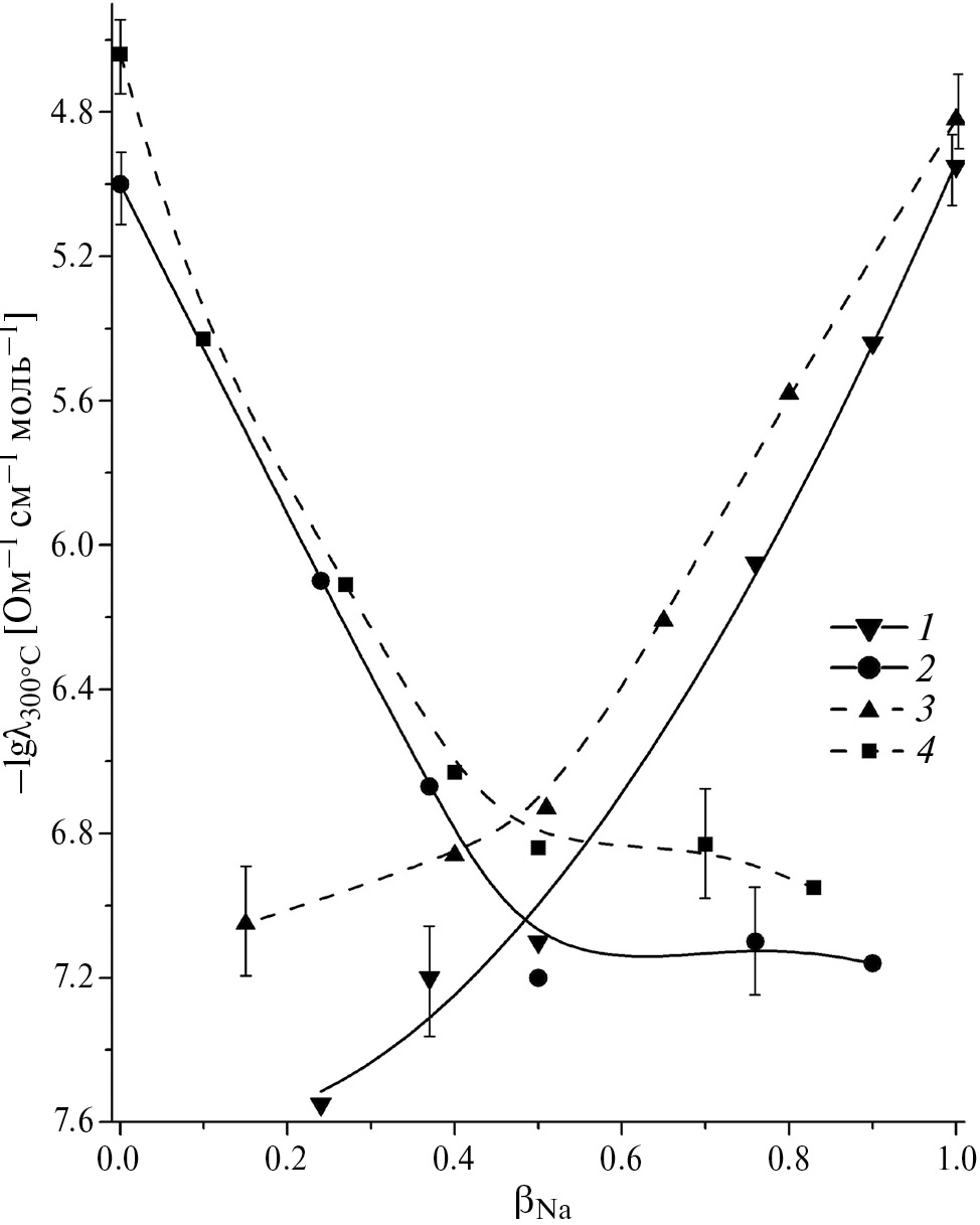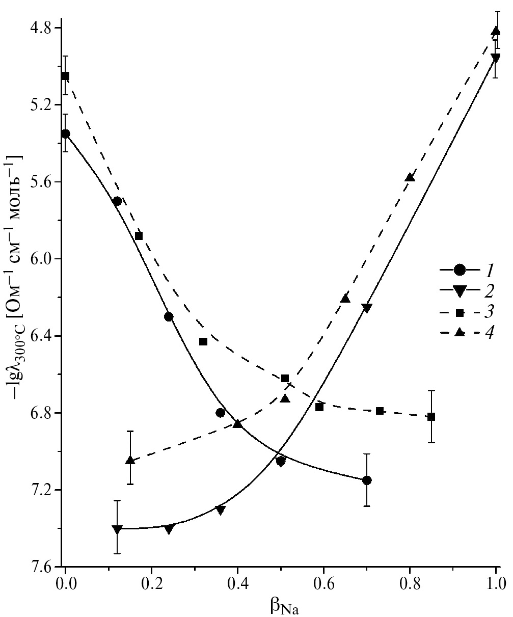 Сама же экстремальная зависимость lgσ = f (βM) удовлетворительно описывается при помощи уравнения (7), применяемо для составов обогащенными щелочными оксидами (рис. 1 и 2). Для получения расчетных кривых использованы собственные данные и наиболее близкие к ним экспериментальные данные из [30]; в табл. 1 мы их не приводим.