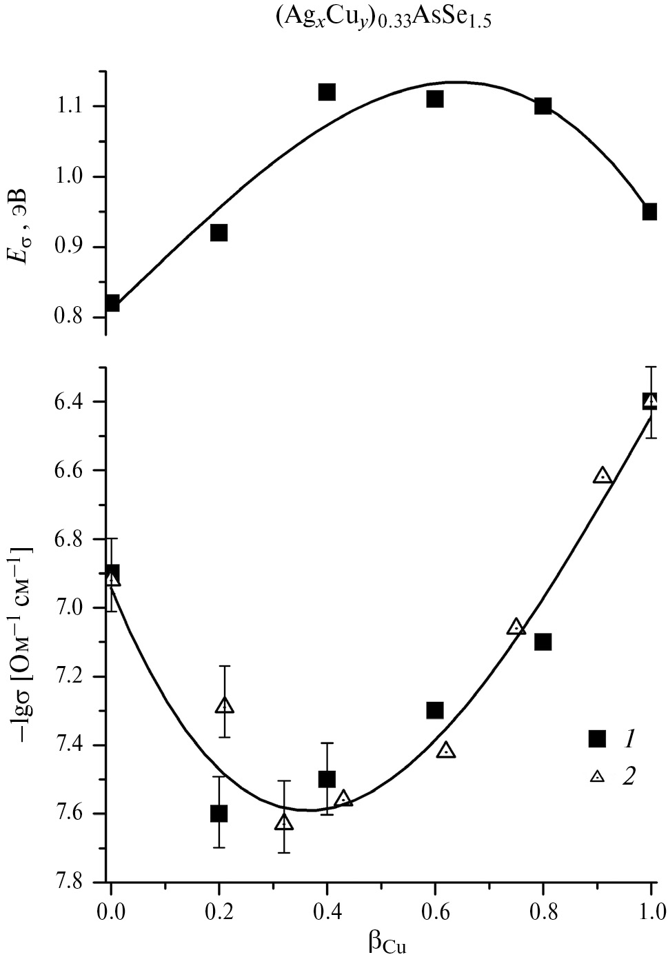 Рис. 5. Изменение удельной электропроводности (σ, при 20°С) и энергии активации электропроводности (Еσ) при эквивалентном замещении серебра на медь в стеклах системы (Ag-Cu)0.33AsSe1.5 . . 1 – эксперимент, 2 – расчет по формуле (1) с использованием данных [25] для стекол разрезов Ag-AsSe1.5 и Cu-AsSe1.5