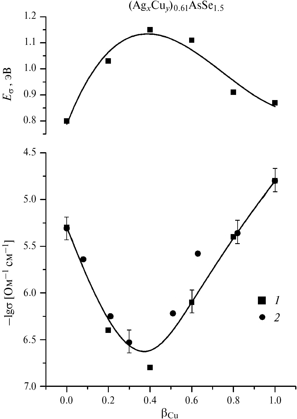 Рис. 6. Изменение удельной электропроводности (σ, при 20°С) и энергии активации электропроводности (Еσ) при эквивалентном замещении серебра на медь в стеклах системы (Ag-Cu)0.61AsSe1.5. 1 – эксперимент, 2 – расчет по формуле (1)