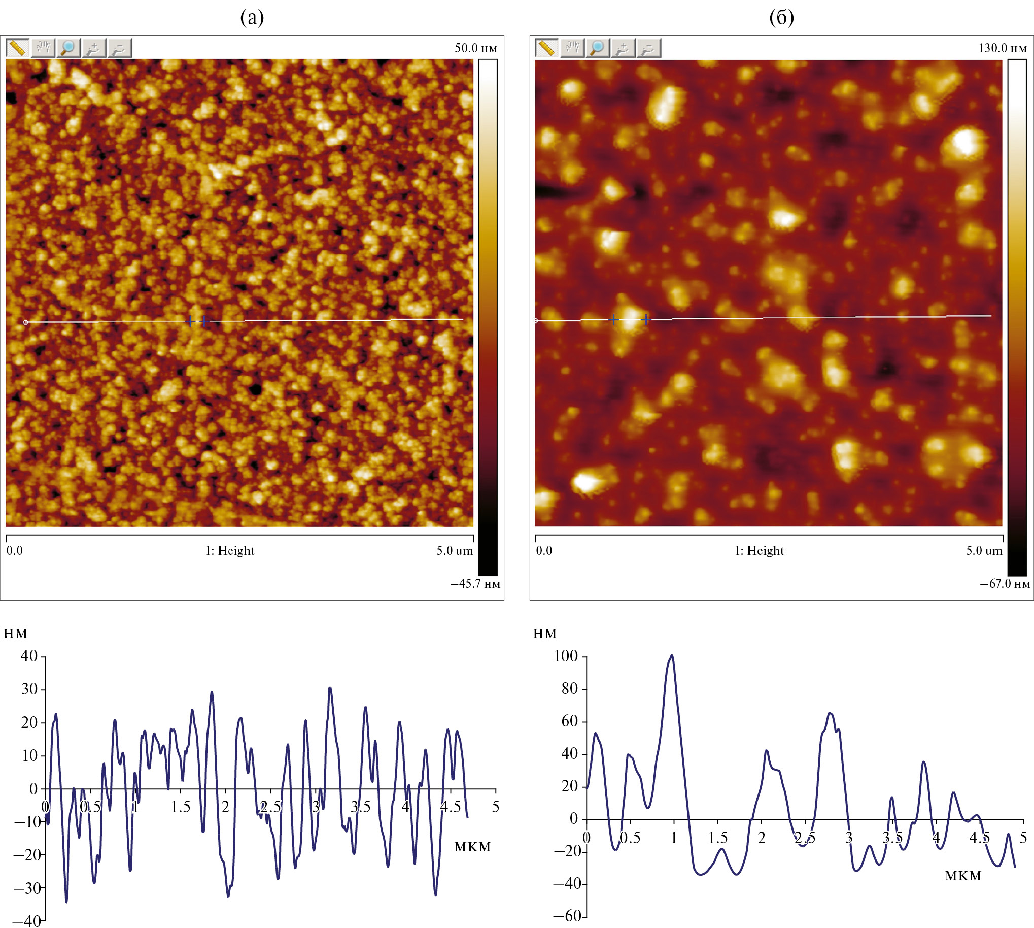Образец, полученный на подслое PEDOT-PAMPSNa (рис. 5б), характеризуется более высокой шероховатостью Rq = 23 нм, его поверхность составлена из двух типов объектов: более крупные – с латеральными размерами 300–400 нм и высотой 50–100 нм и мелкие – размером 100–150 нм и высотой около 30 нм. При сравнении этих значений с типичными для подслоя PEDOT-PAMPSNa [19], необходимо отметить, что в случае гибридного слоя PPy-ZnPc, они в 1.5–2 раза меньше, что связано с более низкой скоростью роста в присутствии фталоцианината.