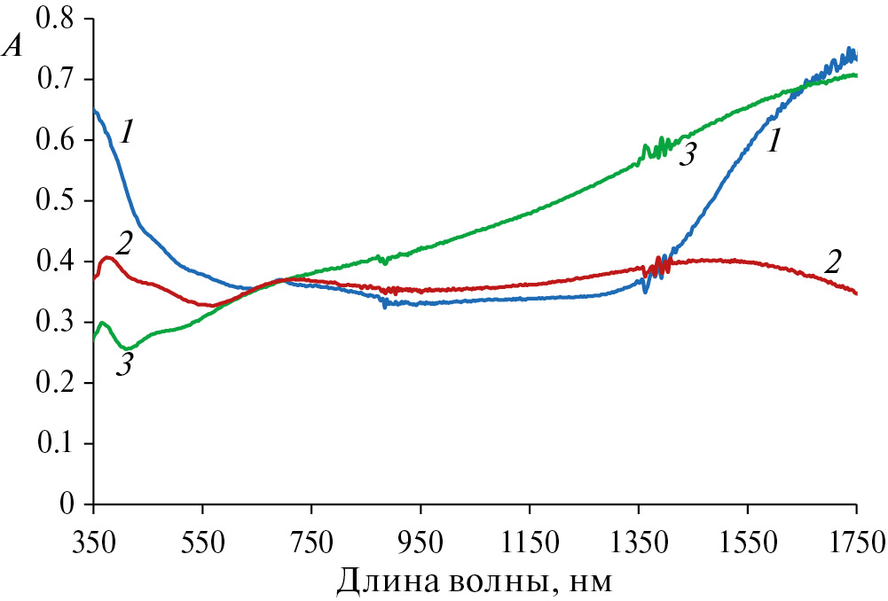 На рис. 6 приведены электронные спектры поглощении гибридного слоя PPy-ZnPc на подслое PEDOT-PAMPSNa (1) и подслоя PEDOT-PAMPSNa (3). Видно, что спектр гибридного слоя имеет форму, схожую со спектром PPy (2), но в нем наблюдается небольшой максимум в области около 700 нм, соответствующий поглощению фталоцианината (678 нм). Резкий рост поглощения в области 1350–1750 нм связан со сложением поглощения подслоя PEDOT и гибридного слоя.