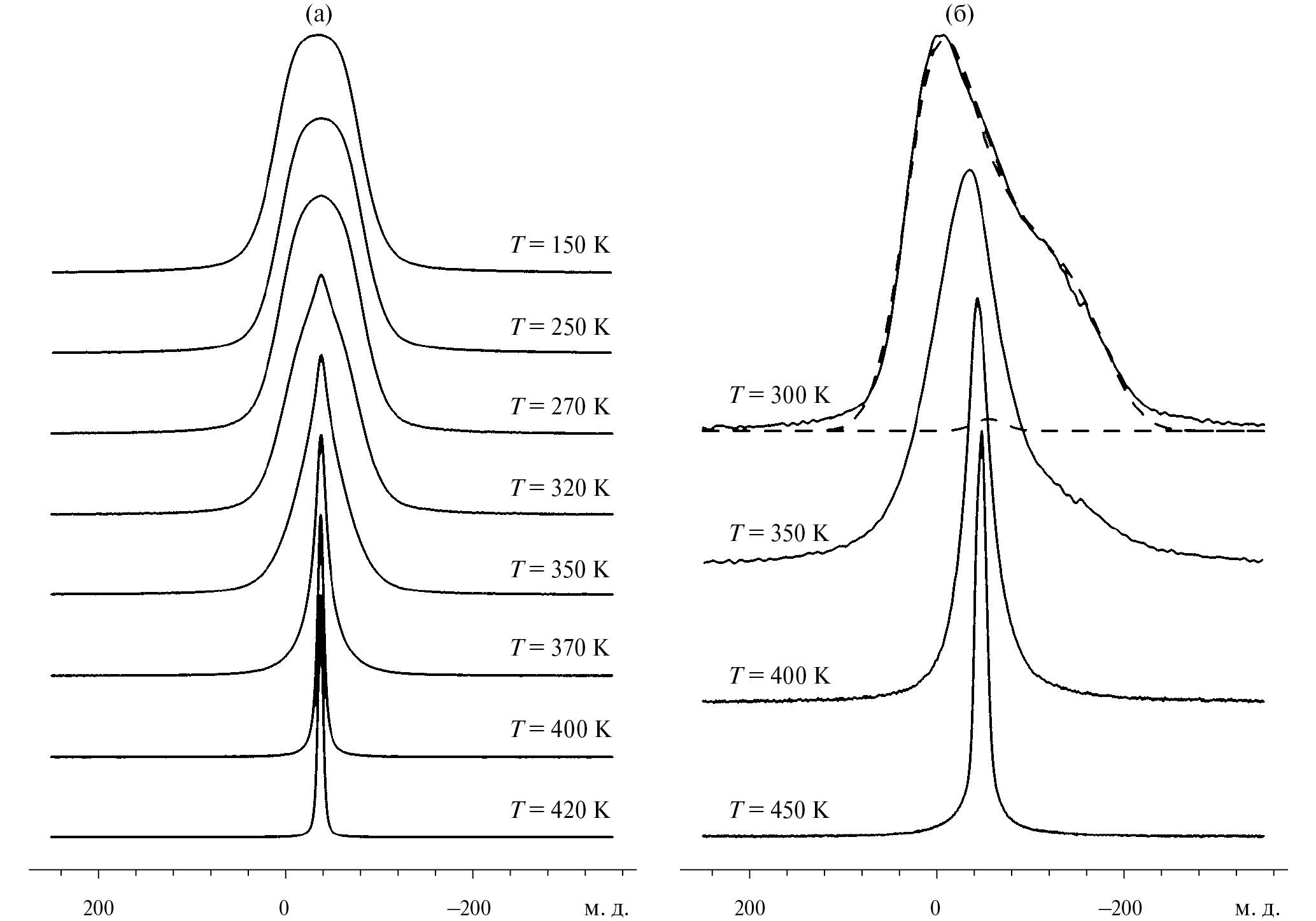 Рис. 2. Спектры ЯМР 19F модельных образцов β-PbF2 (а) и SnF2 (б) при разных температурах. Разложение одного из спектров на компоненты, описываемые функциями Бломбергена–Роуланда и Гаусса (б, пунктир)