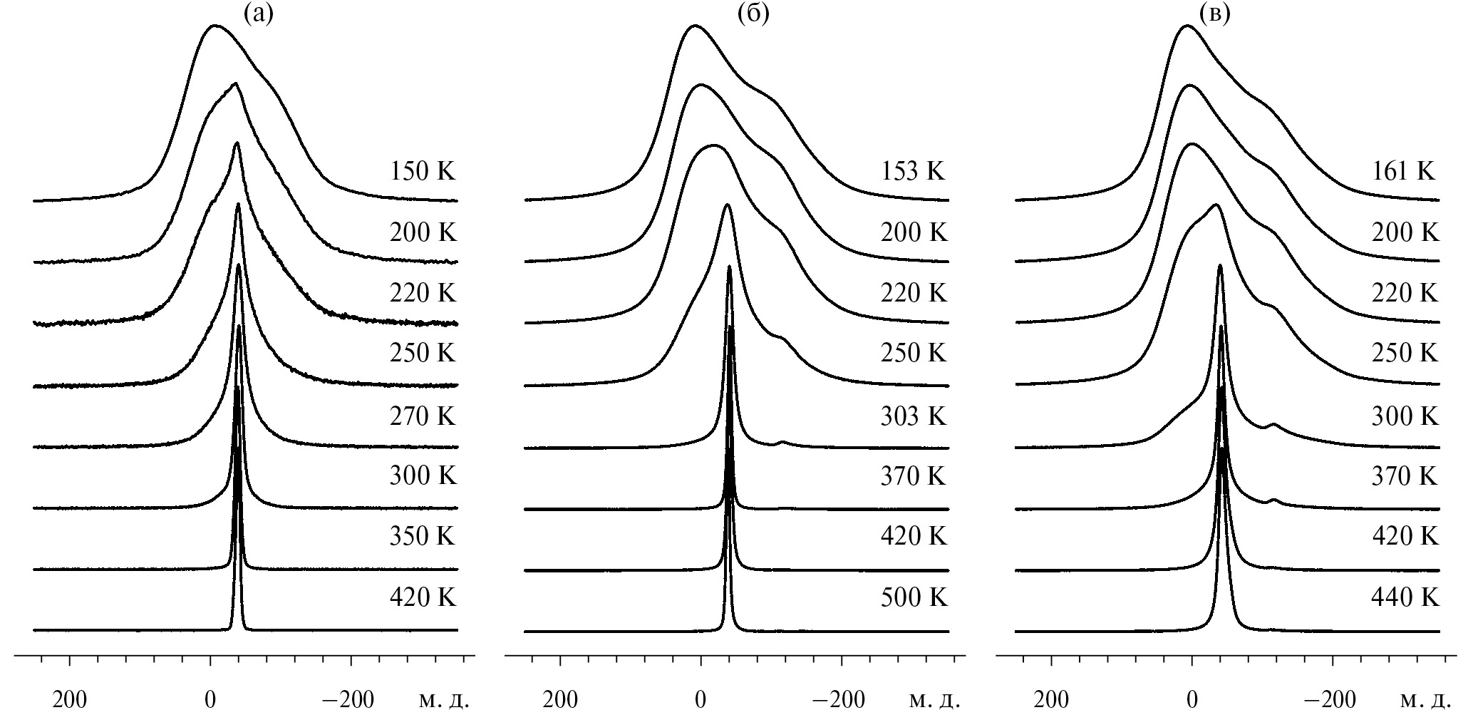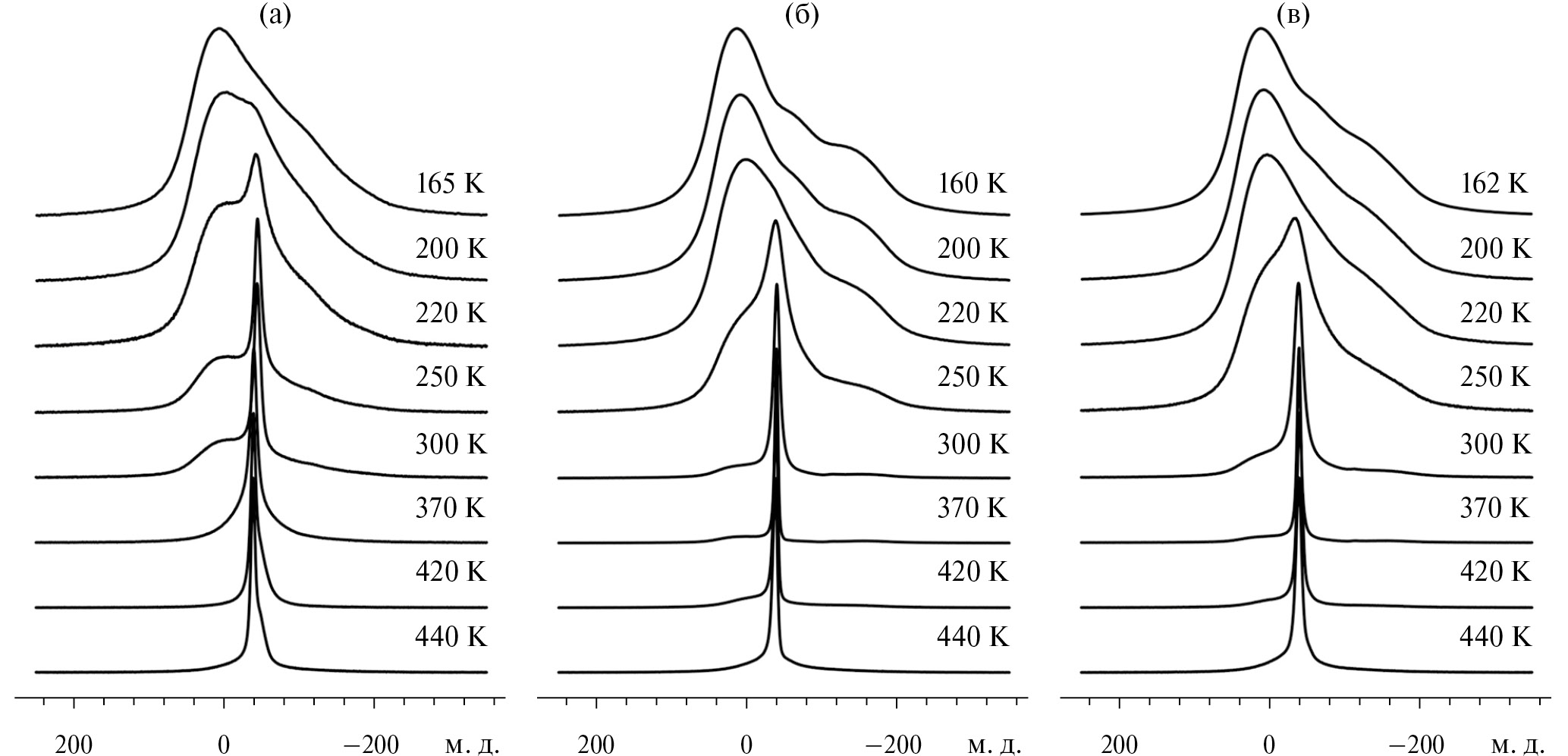 Второй этап трансформации спектра ЯМР 19F связан с преобразованием основной широкой асимметричной компоненты спектра в симметричный сигнал. Этот этап начинается при температурах 250–350 K и в зависимости от состава образца заканчивается к 300–370 K. Спектры ЯМР при этих температурах состоят из узкого (полуширина 1.8 кГц) сигнала лоренцевой формы с ХС –39 ... –41 м. д. и широкого сигнала при –48 ... –50 м. д., имеющего лоренцевую форму для образца E1 и асимметричную форму, аналогичную форме низкотемпературных спектров образцов E2 и E3. Доля неподвижных ионов при 420 K составляет 38, 32 и 16% от общего числа ионов фтора для образцов E1, E2 и E3 соответственно.