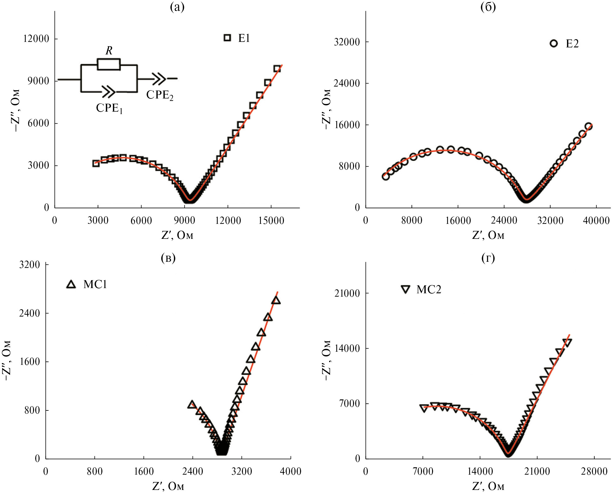 В табл. 2 приведены значения параметров эквивалентной схемы, полученные подгонкой для образцов Е1, Е2, МС1 и МС2, теоретические кривые представлены в сравнении с экспериментальными данными на рис. 6. Видно, что выбранная эквивалентная схема достаточно хорошо описывает импеданс образцов. Анализ годографов импеданса показал, что при всех температурах на них присутствует только одна полуокружность, что указывает на отсутствие существенного вклада импеданса межзеренных границ в общий импеданс образцов.