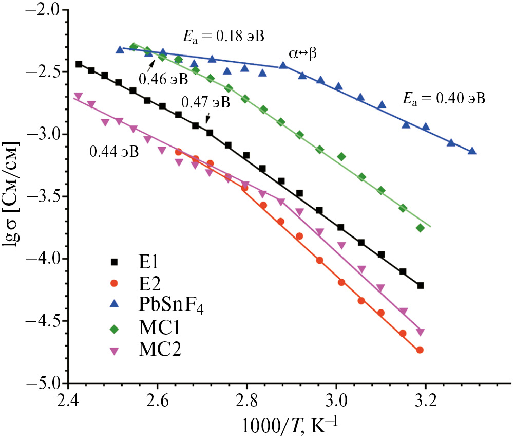 Наиболее высокой электропроводностью из образцов, исследованных впервые, обладает образец флюоритовой структуры MC1. Излом на кривой электропроводности этого образца является наименее ярко выраженным. Проводимость этой фазы при температуре 390 K превышает проводимость PbSnF4, составляя 5 × 10–3 См/см. Похожим образом, но несколько уступая проводимости образца MC1 (3.6 × 10–3 См/см при 410 K), ведет себя электропроводность эвтектического композита E1, полученного медленным охлаждением расплава эвтектического состава. Еще более низкие значения имеет удельная проводимость композитов E2 и MC2 (рис. 7). На температурных зависимостях электропроводности этих образцов при 360 и 350 K соответственно наблюдается излом, похожий на тот, который имеет место для PbSnF4.