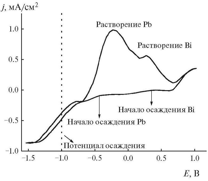 Анализ состава осадков Pb–Bi проводили методом квадратно-волновой инверсионной вольтамперометрии (ИВА) в трехэлектродной электрохимической ячейке с использованием вращающегося дискового стеклоуглеродного электрода (скорость вращения 1300 – об/мин) в качестве рабочего электрода, платиновой сетки – в качестве вспомогательного. Перед проведением измерений рабочий электрод очищали в смеси NaOH и ацетона, после чего подвергали механической полировке до блестящей поверхности с использованием алмазной суспензии с размером зерна абразива 3 и 1 мкм.