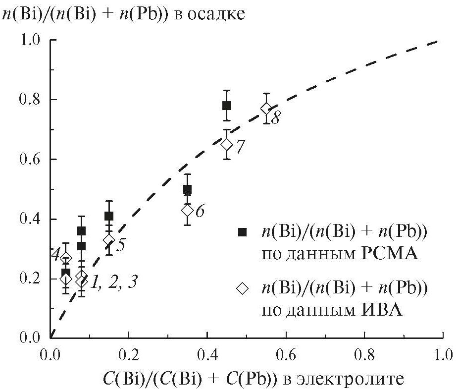 Рис. 4. Мольная доля висмута в электролитическом осадке в зависимости от мольной доли висмута в суммарном содержании свинца и висмута в электролите, определенные методами РСМА и ИВА. Результаты аппроксимации согласно уравнению (2) представлены пунктирной линией