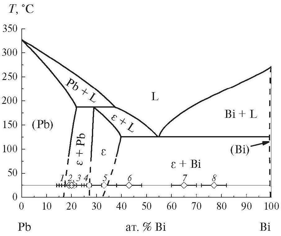 Рис. 5. Фазовая диаграмма для сплавов Pb–Bi (воспроизведена на основании данных работы [7]) и экспериментальные точки, отвечающие составу осадков, полученных в ходе данной работы. Состав осадков определен при помощи инверсионной вольтамперометрии