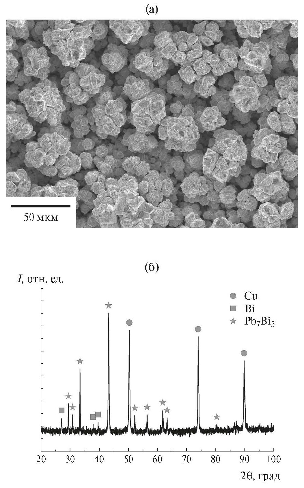 Рис. 7. РЭМ-изображение поверхности осадка, содержащего 27 ат. % Bi, сформированного из электролита состава, мМ: 18.4 Pb(NO3)2, 0.8 Bi(NO3)3, 24.6 ЭДТА-Na2 и 625 NaNO3, на медной подложке при потенциале осаждения –1.0 В (а); и его рентгенограмма (б)