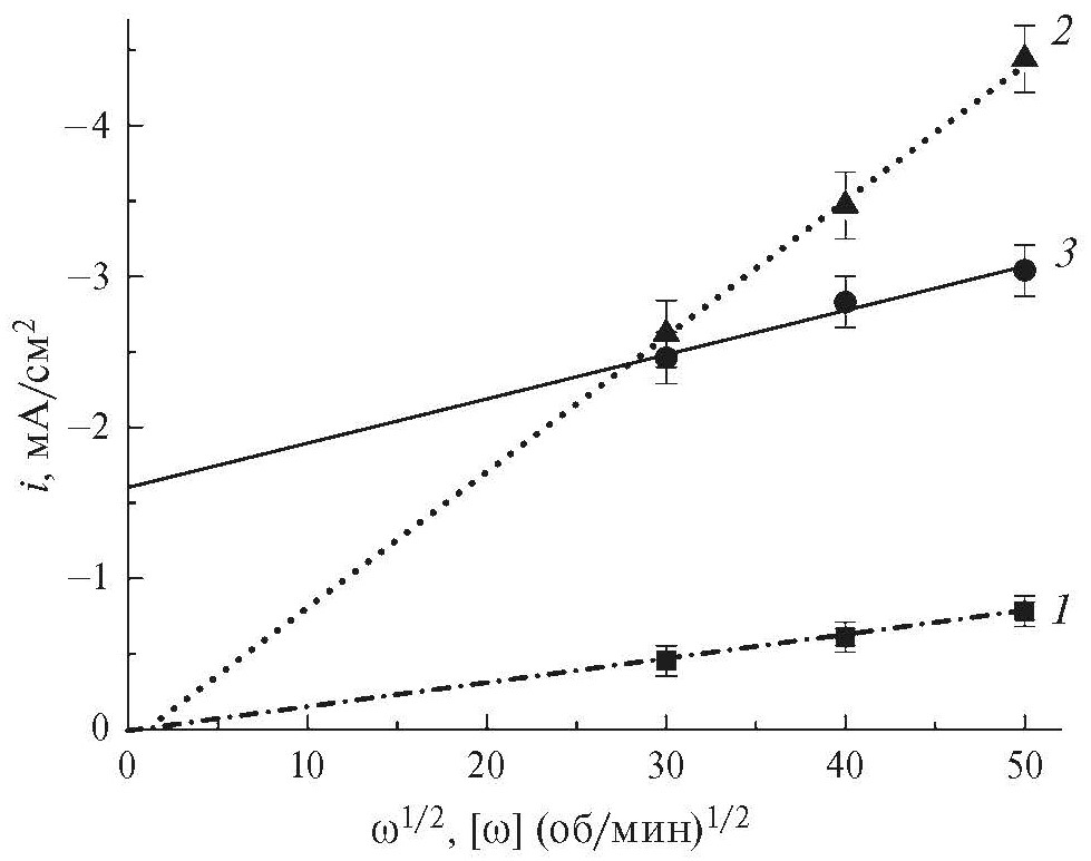 Рис. 2. Величины токов в зависимости от корня из скорости вращения в растворах 0.3 мМ K2FeO4 (1), 1 мМ KMnO4 (2), 1 мМ KMnO4 + 0.3 мМ K2FeO4 (3), измеренные при потенциале –0.3 В. Скорость развертки потенциала – 100 мВ/с