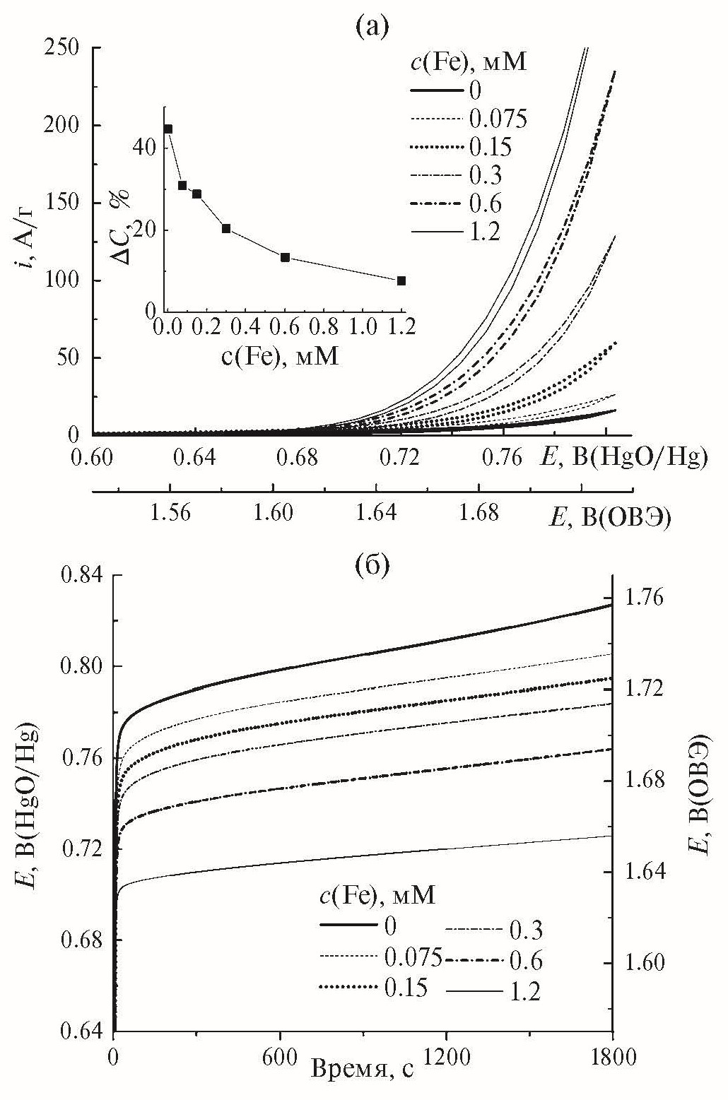 Полученные бирнесситы были подвергнуты испытанию в условиях реакции выделения кислорода (рис. 9а). По мере увеличения содержания железа наблюдается систематический рост тока. Удельные величины, полученные в эксперименте с бирнесситом, осажденном из раствора с c(Fe) = 1.2 мМ, составляют 350 А/г при 1.73 В(ОВЭ), что в 20 раз превосходит ток на недопированном бирнессите.