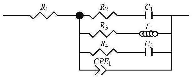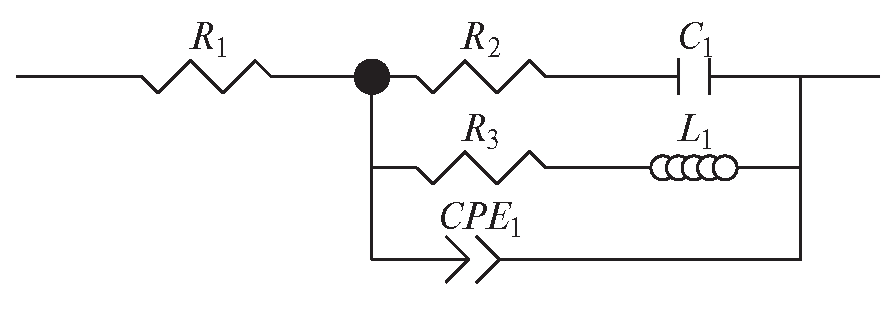 Для образца Mn5Si3-2.85Ge2.85 была предложена другая эквивалентная схема (рис. 9), где вследствие отсутствия четвертого максимума на комплексной плоскости и соответствующей ему емкостной дуги, указывающей на протекание активно-пассивного перехода, цепочка R2C1, содержащая сопротивление переноса заряда и адсорбционную псевдоемкость, описывает анодное растворение марганца. Цепочка R3L1 характеризует процесс накопления адсорбированных частиц на поверхности электрода и их переход в другую форму. В данном случае пассивации электрода не происходит из-за оксидного слоя, слабо блокирующего поверхность, соответственно исключена цепочка, моделирующая сопротивление и емкость оксидной пленки R4C2. Критериальное значение параметра χ2 для элементов лежит в области от 1 × 10–4 до 5 × 10–3, что является удовлетворительным результатом.