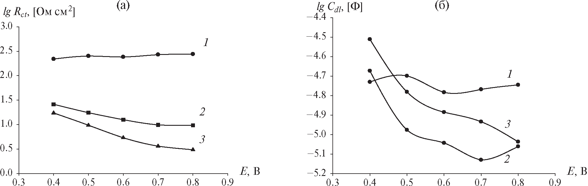 Рис. 10. Зависимость сопротивления переноса заряда (Rct) (а) и емкости ДЭС (Cdl) (б) от потенциала для Mn5Si3-0.60Ge0.60 (1), Mn5Si3-2.40Ge2.40 (2) и Mn5Si3-2.85Ge2.85 (3)
