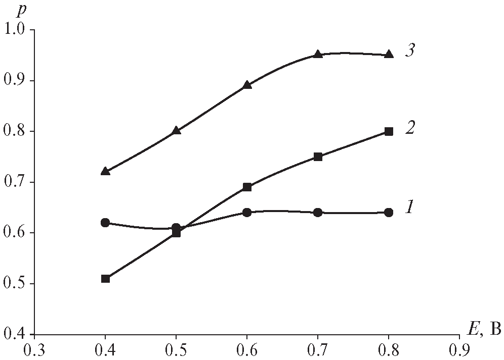 Рис. 11. Зависимость параметра р от потенциала для Mn5Si3-0.60Ge0.60 (1), Mn5Si3-2.40Ge2.40 (2) и Mn5Si3-2.85Ge2.85 (3)