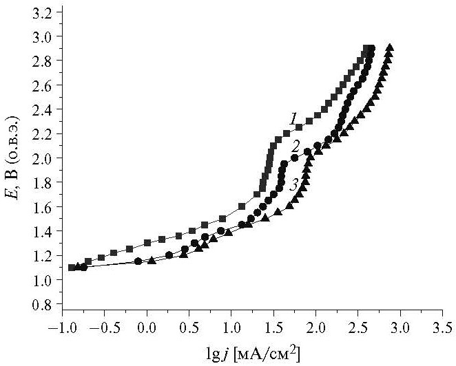 Наибольшая разница между стационарной кривой в фоновом электролите и в присутствии 0.5 М диметилсульфоксида наблюдается в области потенциалов 2.0–2.4 В. При увеличении концентрации до 1.0 М поляризационная потенциостатическая кривая имеет три прямолинейных участка, подчиняющихся тафелевской зависимости.