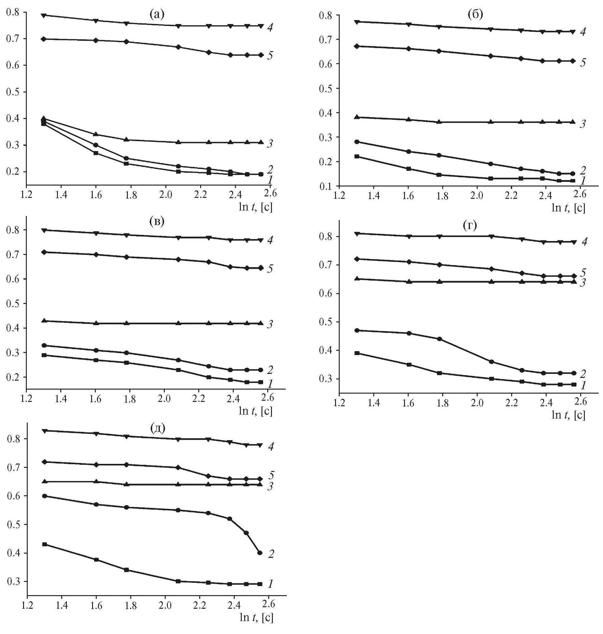 Рис. 3. Степень заполнения поверхности платины частицами диметилсульфоксида при объемной концентрации С, М: 0.001 (а), 0.01 (б), 0.1 (в), 0.2 (г), 0.5 (д) при потенциалах, В: 1.0 (1); 1.2 (2); 1.4 (3); 1.6 (4); 1.8 (5)
