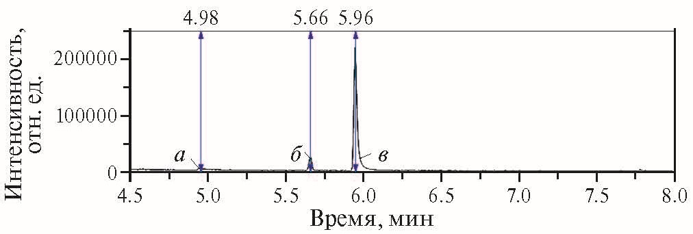 Рис. 4. Ионная хроматограмма: а – диметилсульфоксида, б – диметилсульфона и в – этилового эфира метансульфоновой кислоты (этилметансульфоната). Растворитель – CHCl3