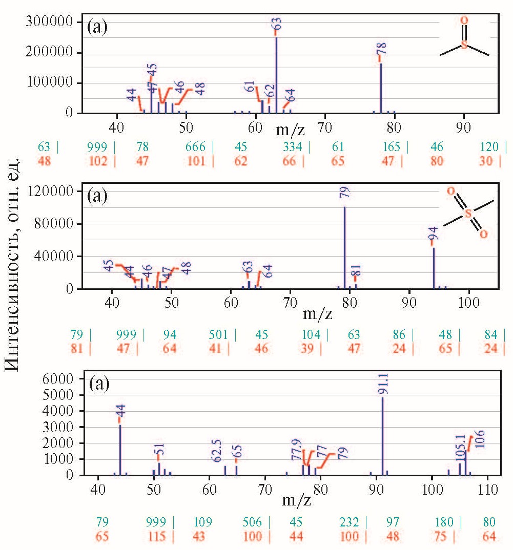 Рис. 5. Экспериментальные масс-спектры: а – диметилсульфоксида, б – диметилсульфона и в – этилового эфира метансульфоновой кислоты (этилметансульфоната) с характерными пиками. Растворитель – CHCl3