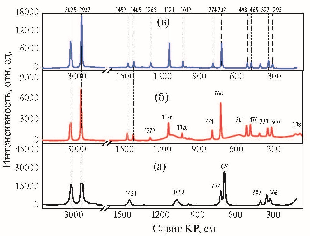Рис. 6. КР-спектр комбинационного рассеяния диметилсульфоксида (а) и продуктов электроокисления диметилсульфоксида–диметилсульфона (б) и метансульфокислоты (в)