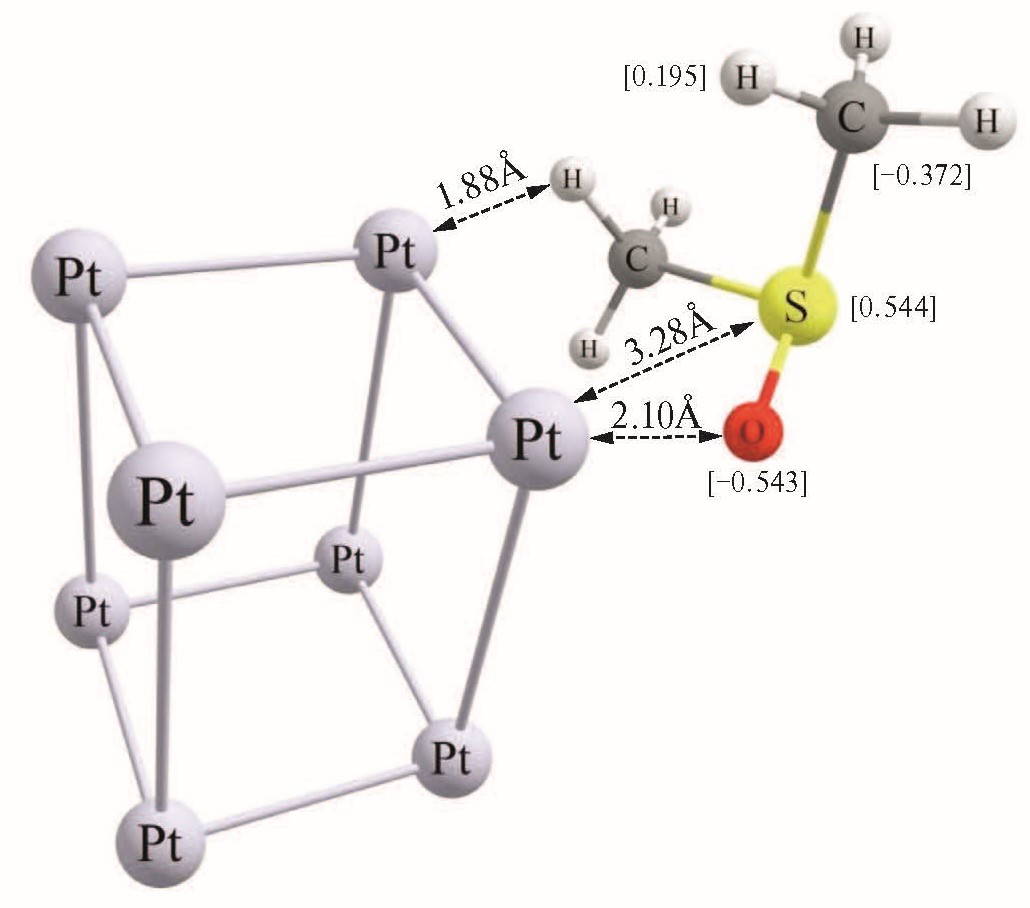 Для объяснения наиболее вероятных путей окисления ДМСО на Pt нами был проведен квантово-химический расчет. Для расчета использовалась модель платины, содержащей в структуре 8 атомов. Оптимизированная структура представлена на рис. 7. Молекула ДМСО помещалась рядом с кластером Pt8. 3D-модели исследуемых молекулярных структур строили в программе ACD/Labs Freeware 2015. Геометрическую оптимизацию и расчет полных энергий проводили методом функционала плотности (DFT) B3LYP [43] c базисным набором def2-TZVP [44] и с учетом влияния водной среды на уровне модельной теории CPCM [18]. Все квантовые расчеты были выполнены с помощью программы Orca 4.2.0 [45].