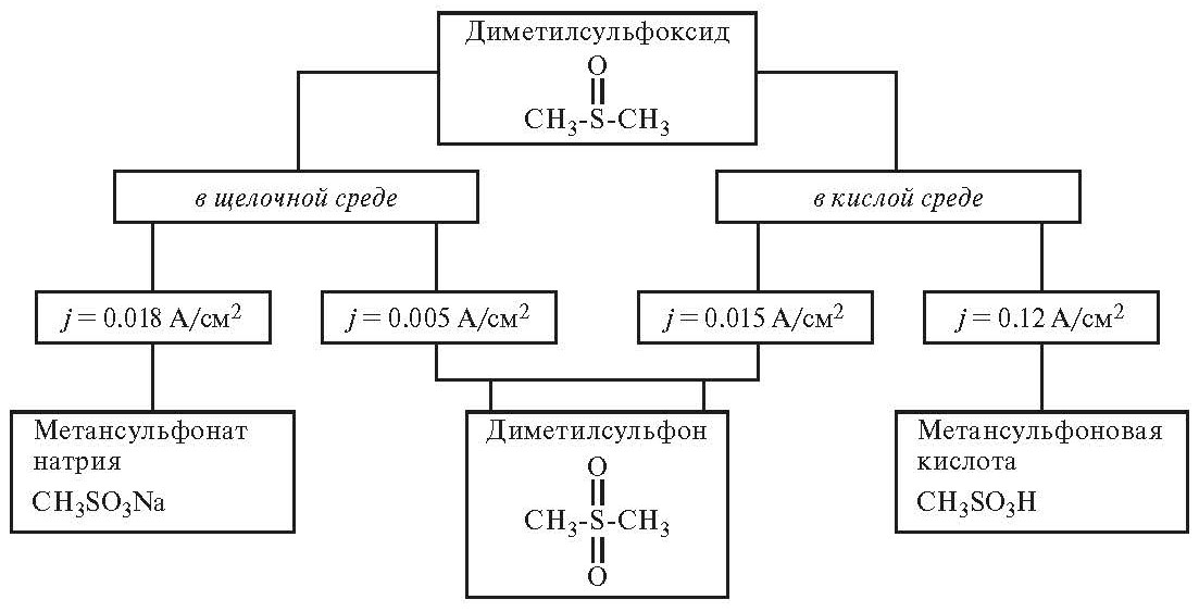 In this work, an electrochemical study of the mechanism of electrooxidation of dimethyl sulfoxide (DMSO) on a platinum electrode in acidic and alkaline solutions was carried out. On stationary polarization anodic curves taken within DMSO in an acidic and alkaline environment, the processing currents are processed manually than in dissolved light. When analyzing linear sections of anodic voltammograms, the values of the coefficients of the Tafel equation were achieved. This definition defines the current density measurement range and conditions for the electrooxidation of DMSO on a platinum (Pt) electrode. Electrolysis was carried out at controlled current densities in an electrolyzer without separation and with separation of the anode and cathode compartments using MK-40, MA-40 membranes and a fluoropolymer sulfcationite membrane MF-4SK. The high electrical conductivity and selectivity of the membranes ensures good performance of the electrolysis process and obtains a high-purity final product. Raman spectroscopy and gas chromatography-mass spectrometry have confirmed that the products of DMSO electrooxidation in an acidic environment are dimethyl sulfone (DMSO2) and methanesulfonic acid (MSA), and in an alkaline environment DMSO2 and sodium methanesulfonate. The method of quantum chemical calculations showed good adsorption of DMSO molecules on platinum within the framework of the cluster model. It has been established that the formation of MSA on the surface of a platinum electrode at high current densities occurs via the radical ion mechanism, by breaking the C–S bond. Based on the experimental results obtained, a scheme for the electrochemical oxidation of dimethyl sulfoxide on platinum is proposed.