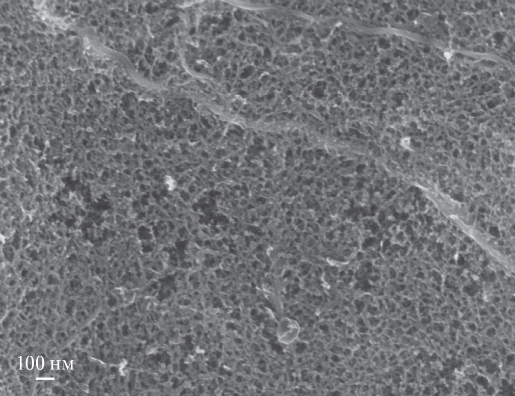 Для применения КУНБ в СК с органическими электролитами необходимо разработать способ расширения ультрамикропор в материале до 1 нм и более. Это было сделано путем активации КУНБ гидроокисью калия. Активация бумаги проводилась пропиткой углеродной нанобумаги в растворе КОН заданной концентрации и нагревом пропитанного образца нанобумаги в вакуумной печи до 800°С с выдержкой при этой температуре в течение часа. Подробно эта методика описана в [21]. На рис. 3, 4 показаны снимки СЭМ-образцов активированной нанобумаги с различной степенью активации. Количественно степень активации оценивалась по величине потери массы C-ксерогеля.