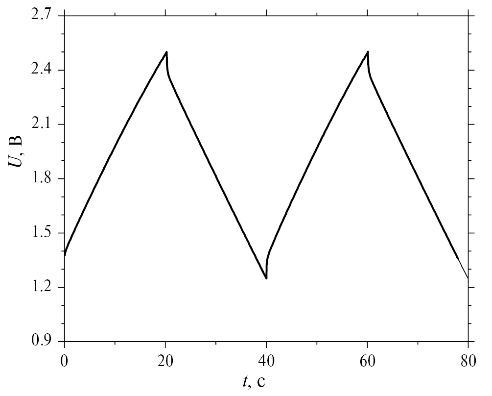 Рис. 5. Изменение напряжения на ячейке СК в цикле гальваностатического заряда-разряда при плотности тока I = 24 мА/см2. Электроды изготовлены из КУНБ со степенью активации 13–16%.