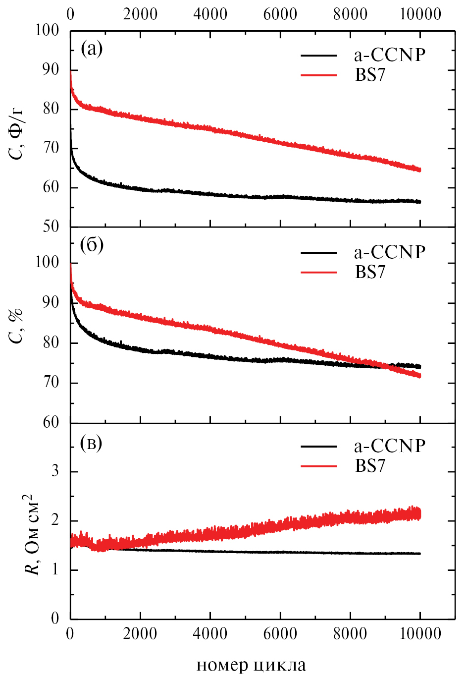 На рис. 9 представлены ресурсные испытания циклическим разрядом при токе Ishort/40 [27] электродов из а-КУНБ и активированного угля BS7. Основное падение емкости электродов из а-КУНБ наблюдается в течение первых 1000 циклов (на ~20%), и далее емкость остается почти постоянной. Напротив, у активированного угля BS7 электрохимическая емкость после резкого спада в течение первых 1000 циклов и далее продолжает линейно уменьшаться с увеличением количества циклов испытания, что делает этот уголь непригодным для применения в СК с ДЭС. Анализ процесса “старения” углеродных электродов в органических электролитах показал [29, 30], что падение электрохимической емкости связано с наличием на электроде поверхностных функциональных групп кислотного типа. Стабильность работы электрода существенно возрастает только при содержании таких групп менее 5%.