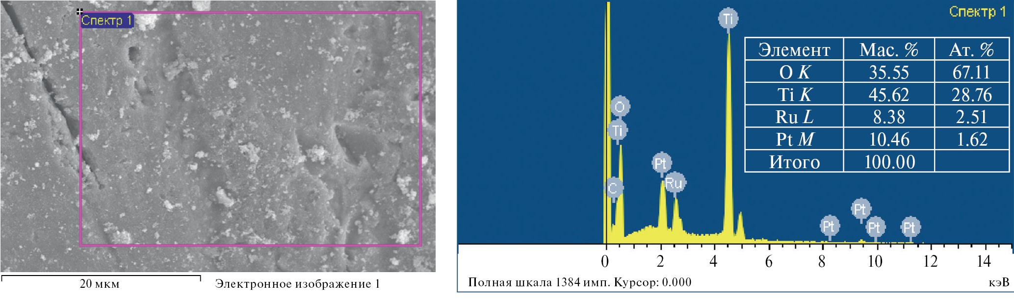 Рис. 1. Микрофотография и соответствующие данные энергодисперсионной рентгеновской спектроскопии образца Ru12.