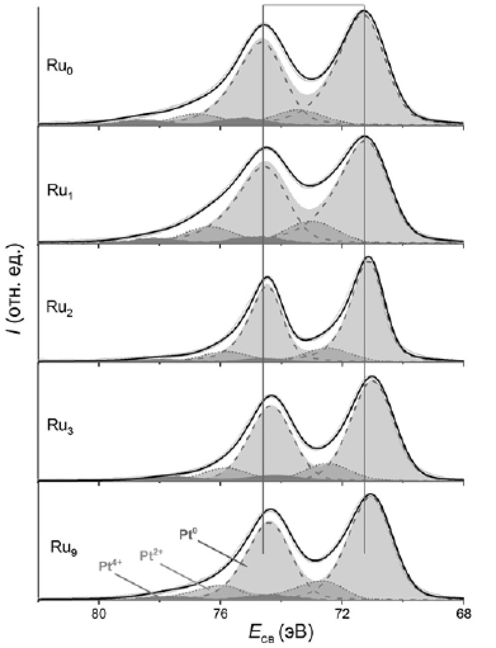 Спектры всех образцов хорошо описываются 6 пиками или тремя дуплетами, соответствующими платине в трех зарядовых состояниях (металлическая платина, моно- и диоксид [35–39]). Самый интенсивный дуплет платины в металлическом состоянии с Eсв = 71.3 и 74.6 эВ имеет ассиметричную форму с удлинением в сторону бóльших энергий связи, характерную для металлов платиновой группы [35, 40–42]. Относительная интенсивность (площадь) дуплета, соответствующего Pt0, в этих образцах составляет ~82% (табл. 2). В отличие от литературных данных, где наблюдается сильный сдвиг положения пиков дуплета платины Pt0 на недопированном оксиде титана в область меньших энергий, связанный с усилением взаимодействия платины с носителем [8, 37, 43–45], в данной работе энергия связи соответствует объемной металлической платине (71.1–71.3 эВ). При допировании TiO2 с увеличением содержания диоксида рутения положение пиков Pt0 смещается в область меньших энергий на 0.1–0.3 эВ, что может быть связано с появлением примесных уровней в запрещенной зоне диоксида титана при допировании его RuO2 [18], что и приводит к увеличению электронной плотности на платине.