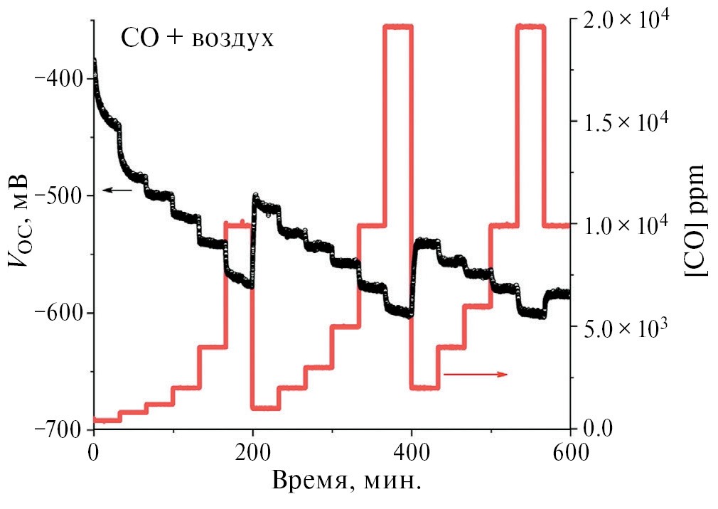 Рис. 6. Пример изменения концентрации монооксида углерода и напряжения разомкнутой цепи сенсорной ячейки с рабочим электродом на основе Ru1 от времени.