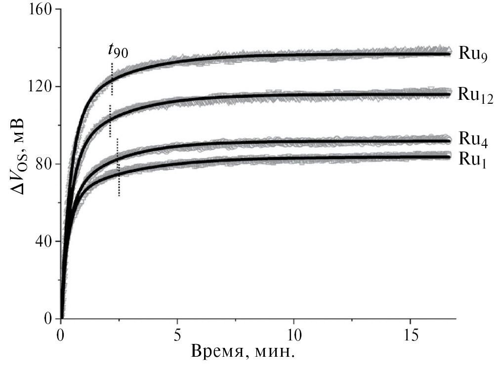 где ΔVOC – изменение выходного сигнала потенциометрического датчика за время t с момента изменения концентрации тестируемого компонента (для которой ΔVOC = 0 при t = 0 и ΔVOC → Vst – Vonset при t → ∞), Vst – сигнал потенциометрического датчика, стабилизированный после изменения концентрации (отклик сенсора), Vonset – сигнал потенциометрического сенсора до изменения концентрации, τ – постоянная времени. В нашем случае все кривые релаксации можно описать функцией, состоящей из быстрого показателя (τ1) и медленного показателя (τ2):