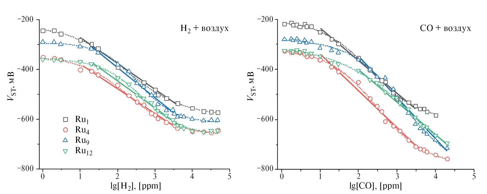 В исследуемом диапазоне концентраций анализируемого газа 1–50 000 ppm величина Vst имеет S-образную зависимость от логарифма концентрации как H2, так и CO (рис. 8). Таким образом, в указанном диапазоне достигается нижний и верхний пределы обнаружения определяемых газов. Особенно явно это наблюдается в случае определения водорода в воздухе: независимо от содержания оксидного носителя линейный участок лежит в области от 20 до 4 000 ppm. При замене водорода в потоке воздуха монооксидом углерода наблюдается зависимость пределов обнаружения CO от состава оксидного носителя: при содержании диоксида рутения x ≤ 4% пределы обнаружения сенсоров не изменяются по сравнению с определением H2, с увеличением x > 4% линейный участок концентрационной зависимости Vst сдвигается в область бóльших концентраций 100–20 000 ppm (рис. 7, табл. 2). В целом, рабочий диапазон газовых сенсоров с исследуемыми электрокатализаторами способны определить изменение концентрации водорода и монооксида углерода в пределах двух порядков.