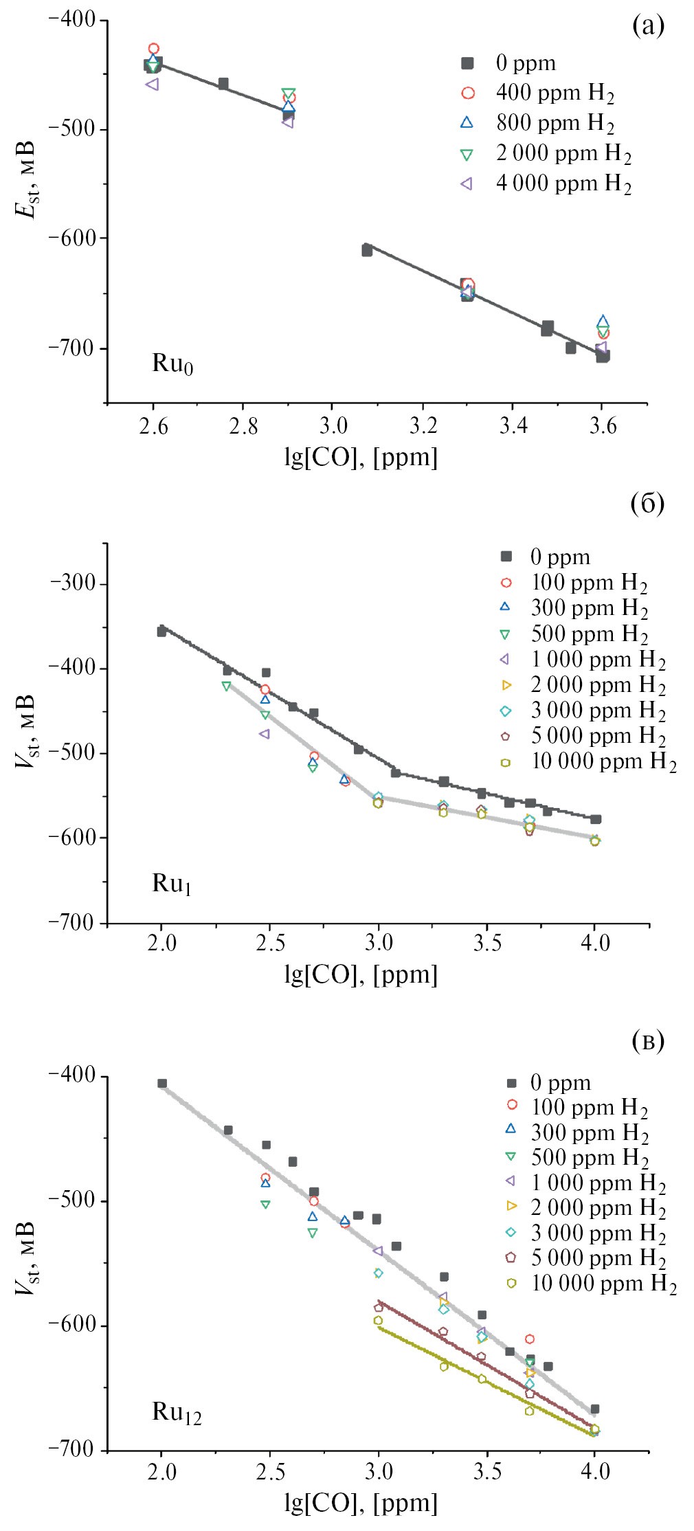 Рис. 9. Зависимости напряжения разомкнутой цепи сенсоров от концентрации H2 для сенсоров с рабочим электродом на основе Ru0 (а), Ru1 (б) и Ru12 (в) при их одновременном присутствии в потоке воздуха.