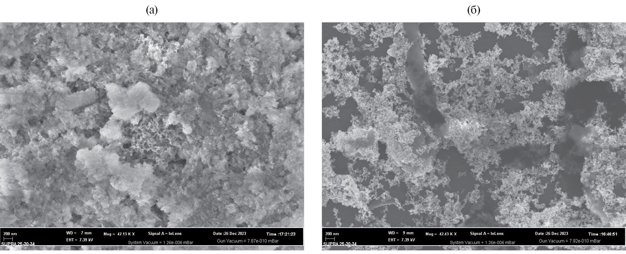 Рис. 1. СЭМ-изображения образцов PdNi/МГС (а) и PdNiмод/МГС (б).