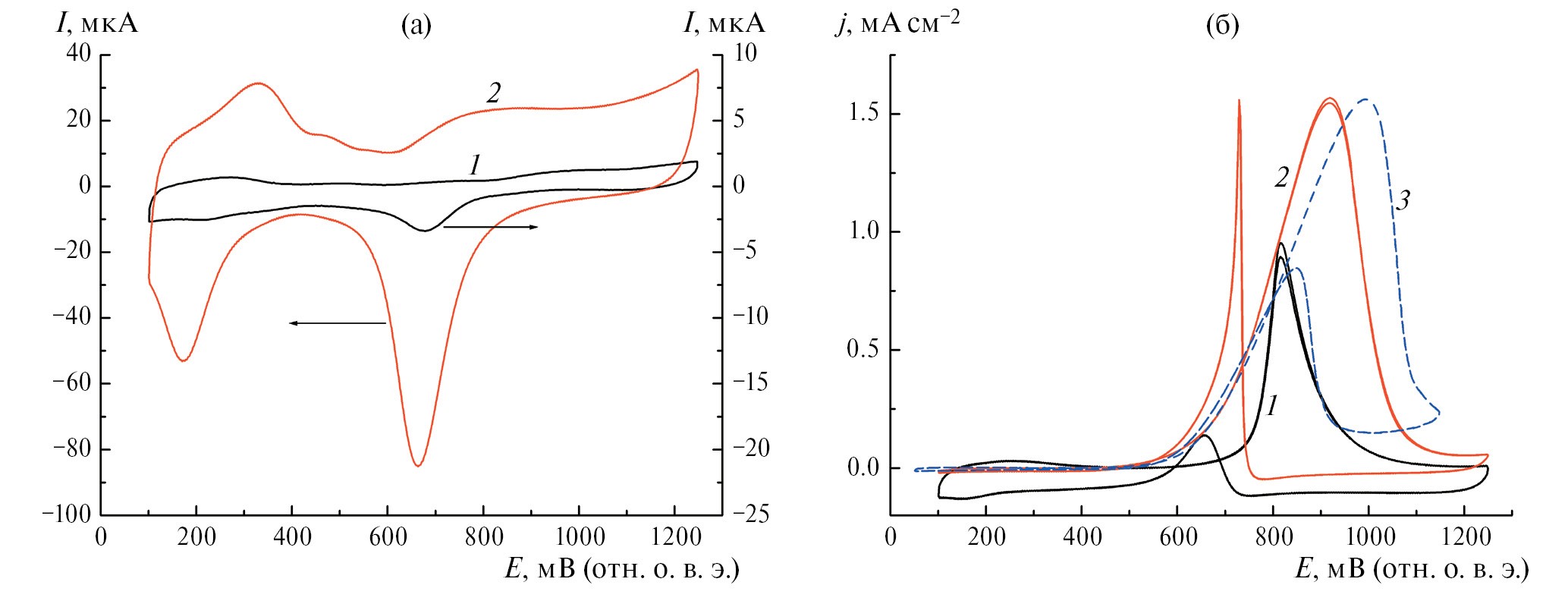 Рис. 3. (а) ЦВА для PdNi/МГС (1) и PdNiмод/МГС (2), деаэрированный раствор 0.1 M KOH, 50 мВ/с. (б) Окисление метанола на PdNi/МГС (1), PdNiмод/МГС (2) и Pt/C (3), деаэрированный раствор 0.1 M KOH + 1 M CH3OH, 50 мВ/с, 2000 об/мин.