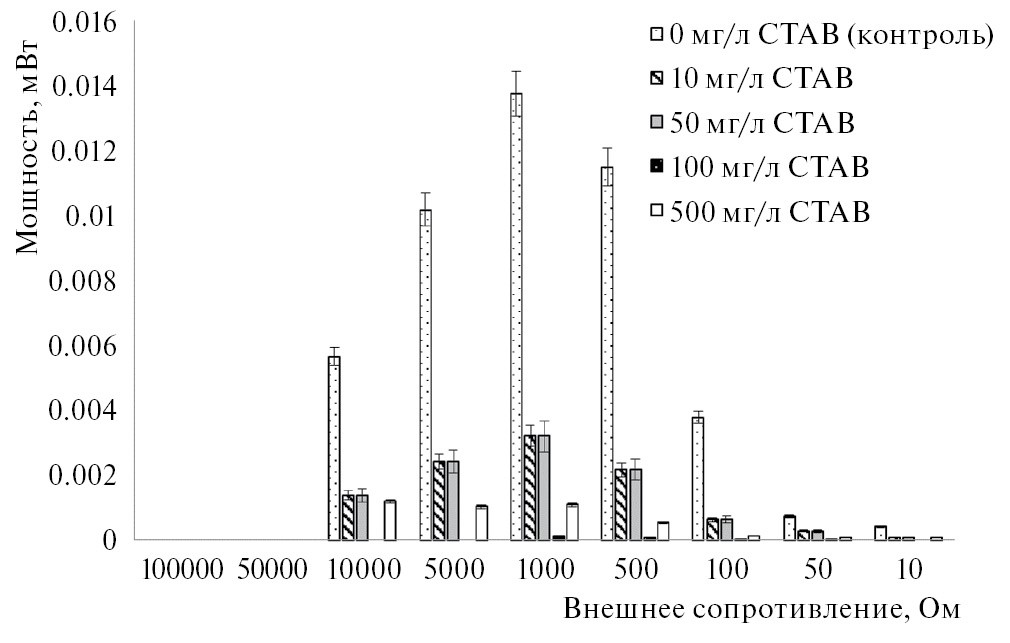 Максимальная мощность, генерируемая в исследуемых БТЭ штаммом M. luteus, развивалась при его работе на внешнюю нагрузку 1 кОм. В отсутствие ПАВ этот показатель на 5 сут экспонирования составлял 0.014 мВт. При внесении в анолит БТЭ 10 и 50 мг/л СТАВ значение максимальной мощности было значительно ниже – 0.003 мВт. Дальнейшее повышение содержания СТАВ в анолите БТЭ практически полностью ингибировало процесс электрогенерации (рис. 3).