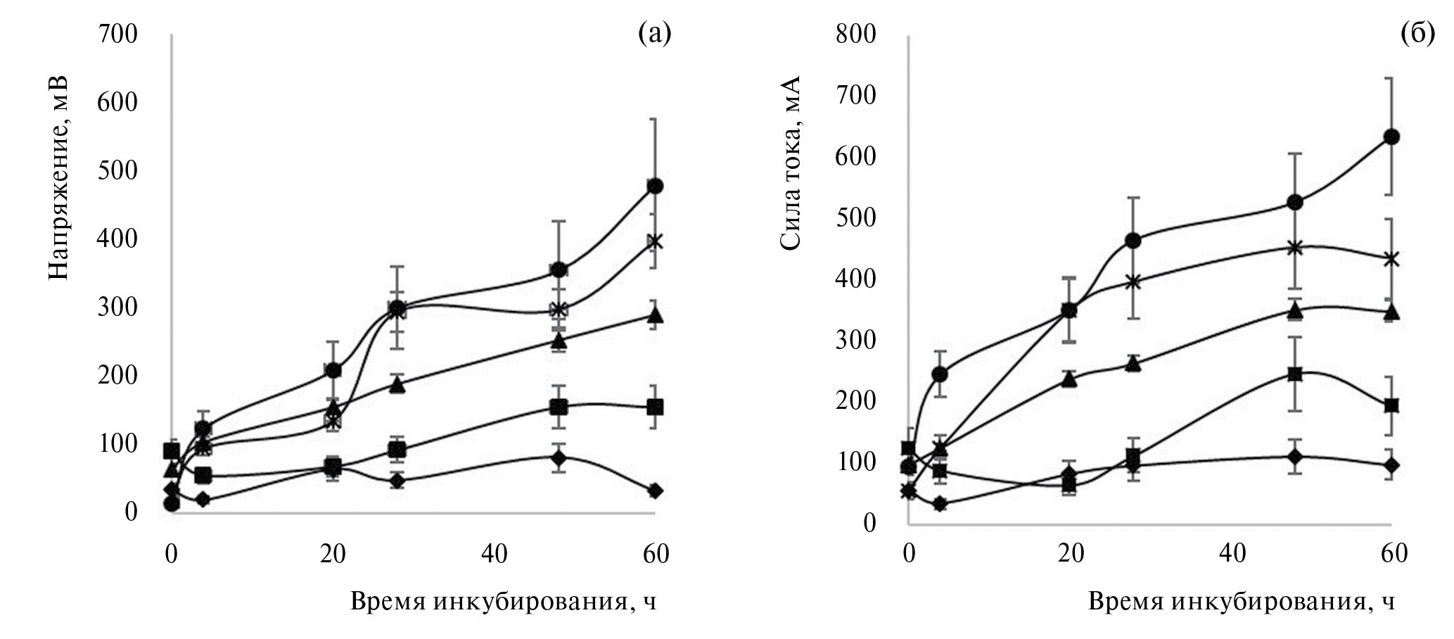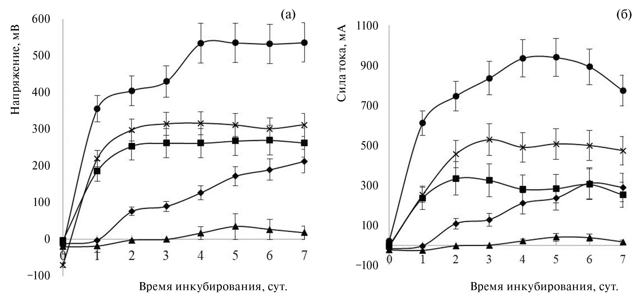 Рис. 4. Влияние неионогенного ПАВ твина-80 на динамику напряжения (измерено в режиме разомкнутой цепи) (а) и силу тока (б) (измерено в режиме короткого замыкания), генерируемого в БТЭ штаммом M. luteus 1-и (анолит – модельная сточная вода (субстрат – пептон 500 мг/л), электроды – углеродная ткань); ● – контроль (без ПАВ); × – твин-80 5 мл/л; ▲ – твин-80 10 мл/л; ■ – твин-80 30 мл/л; ♦ – твин-80 50 мл/л.